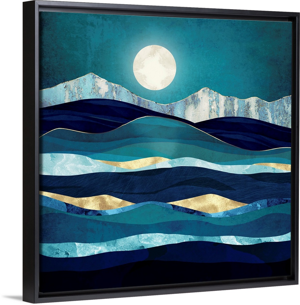 <p>Abstract landscape of rolling waves featurine water, moon, blue, gold and texture.</p>