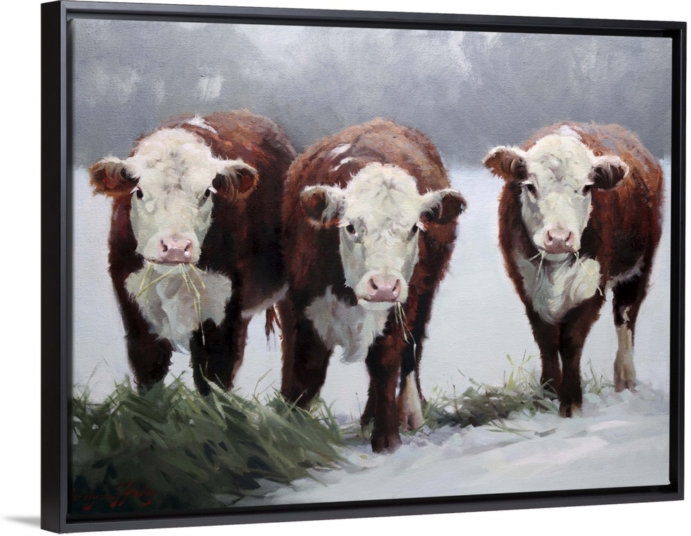 <p>Contemporary artwork of three brown and white cows in the snow.</p>