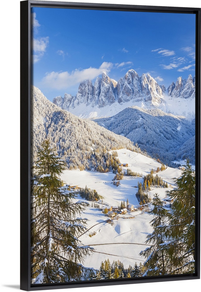 <p>Winter snow; St. Magdalena village; Geisler Spitzen (3060m); Val di Funes; Dolomites mountains; Trentino-Alto Adige; South Tirol; Italy</p>