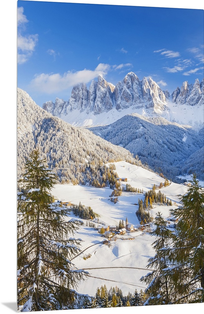 <p>Winter snow; St. Magdalena village; Geisler Spitzen (3060m); Val di Funes; Dolomites mountains; Trentino-Alto Adige; South Tirol; Italy</p>