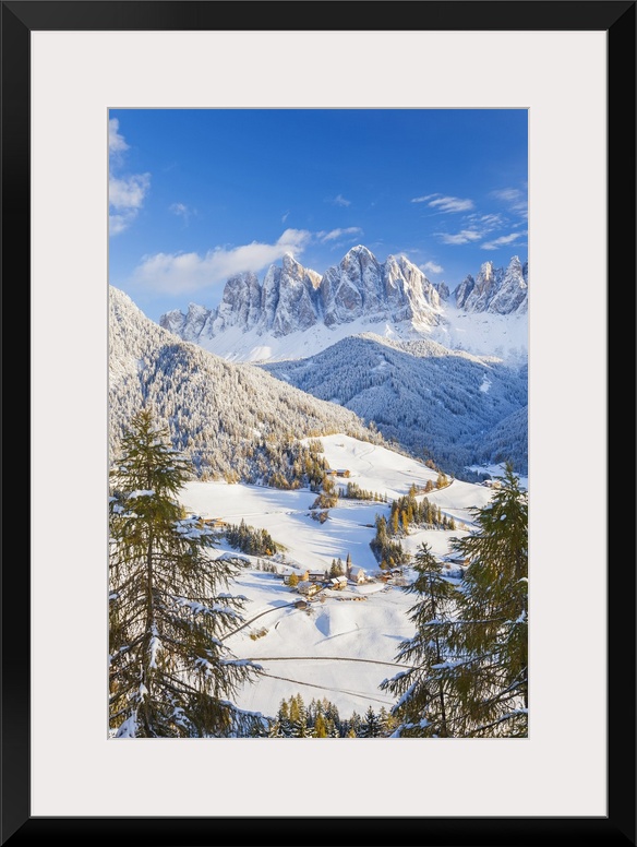 <p>Winter snow; St. Magdalena village; Geisler Spitzen (3060m); Val di Funes; Dolomites mountains; Trentino-Alto Adige; South Tirol; Italy</p>