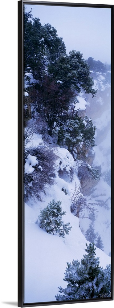 <p>Vertical photograph of a snowy cliffside full of hardy bushes and trees under a deep layer of snow in Arizona.</p>