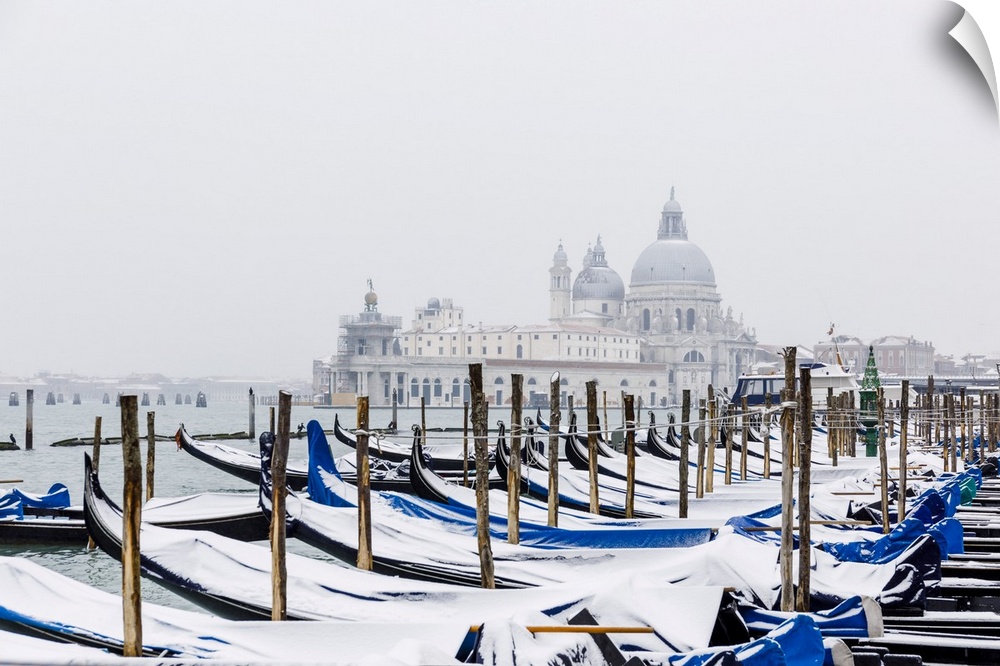 <p>Winter snowfall in the city of Venice, gondolas covered by snow and in the background the church of Santa Maria della Salute, Venice, Veneto, Italy</p>