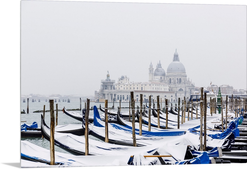 <p>Winter snowfall in the city of Venice, gondolas covered by snow and in the background the church of Santa Maria della Salute, Venice, Veneto, Italy</p>