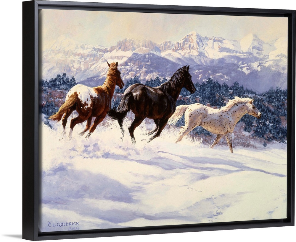 <p>Contemporary colorful painting of a herd of horses running through a snowy meadow, with a mountain range in the background.</p>