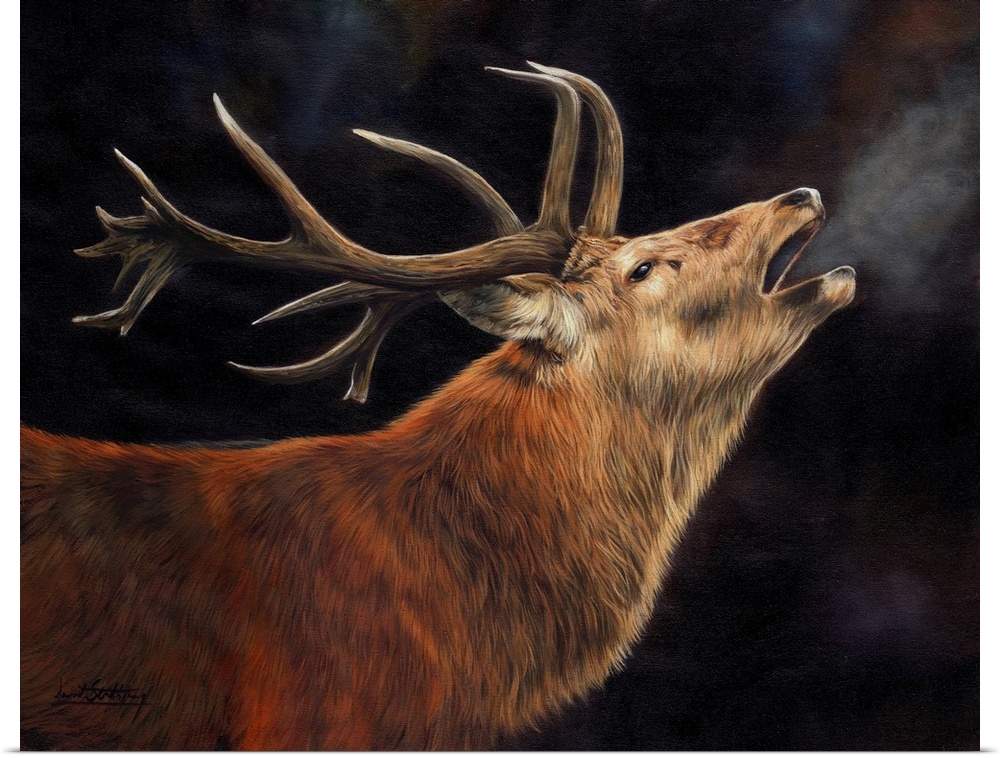 <p>Contemporary painting of male deer bellowing into the cold air.</p>
