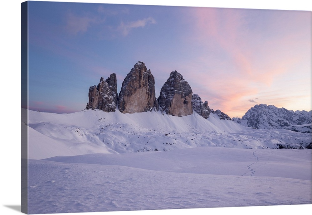 <p>Winter sunset of the Three Peaks, Bolzano district, South Tyrol, Italy, Europe.</p>