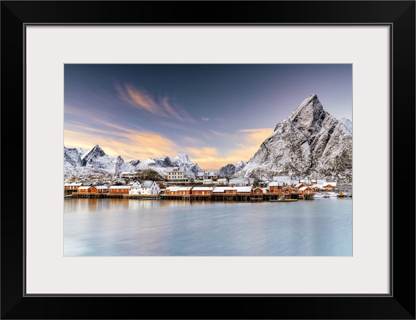 <p>Winter sunset over snowcapped mountains and Sakrisoy village by the frozen sea, Reine, Nordland, Lofoten Islands, Norway, Scandinavia, Europe</p>