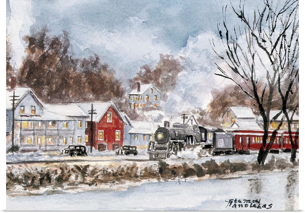 Art Cityscapes Contemporary Art Winter Landscapes Snowscapes Villages Stanton Manolakas Painting Transportation Train Watercolor