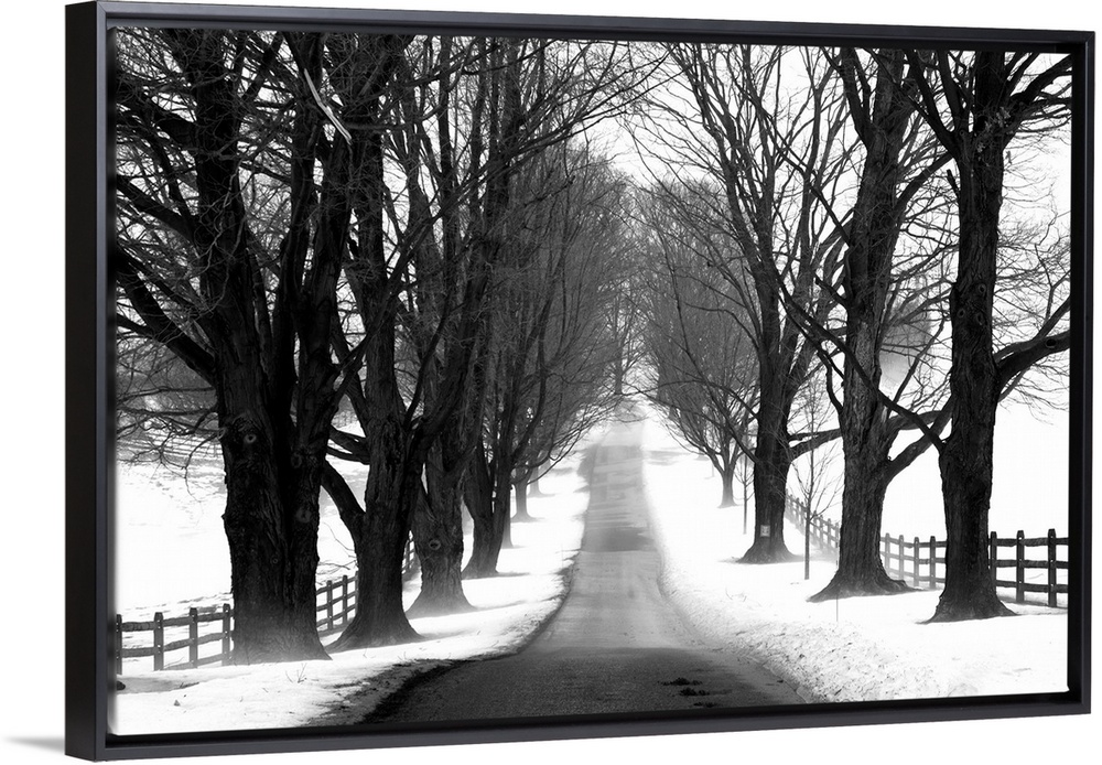 <p>Winter scene of a road lined with dark trees and a wooden fence in the countryside.</p>