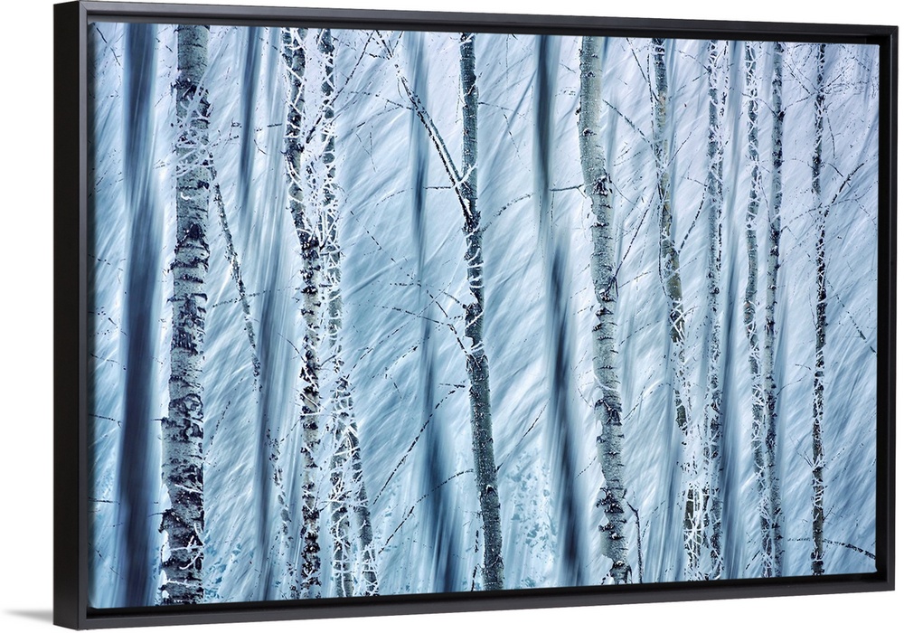 <p>In-camera double exposure photo of a group of tall, straight trees, in Winter, right after a snow storm. The first image is a still shot of the line of trees, the second is made using the ICM (Intentional Camera Movement) technique. The combination of these two techniques into one photo gives back to the viewer both the stillness of Winter and the wild abandon of snow on trees. Ursula Abresch Winter Collection.</p>