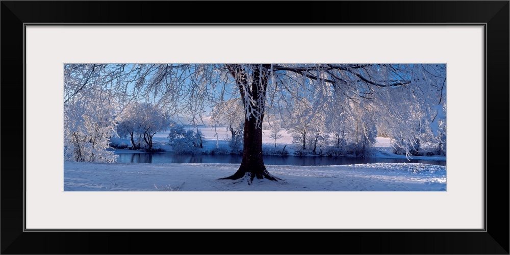 <p>Panoramic size wall art of a tree covered in snow and ice in this landscape photograph.</p>