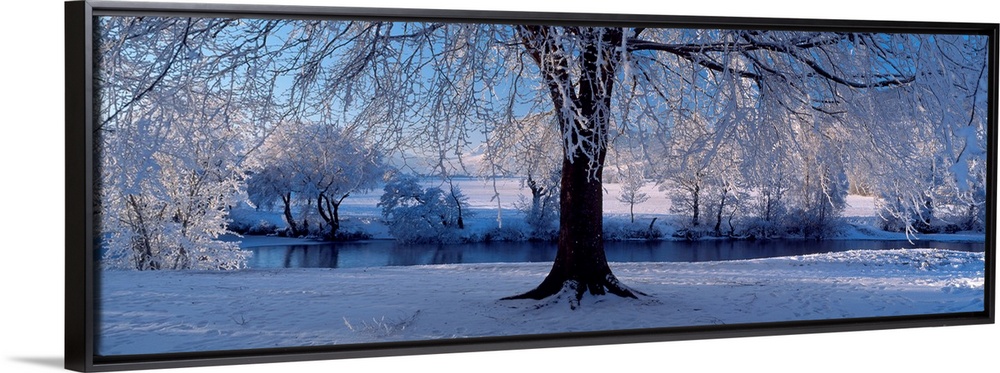 <p>Panoramic size wall art of a tree covered in snow and ice in this landscape photograph.</p>