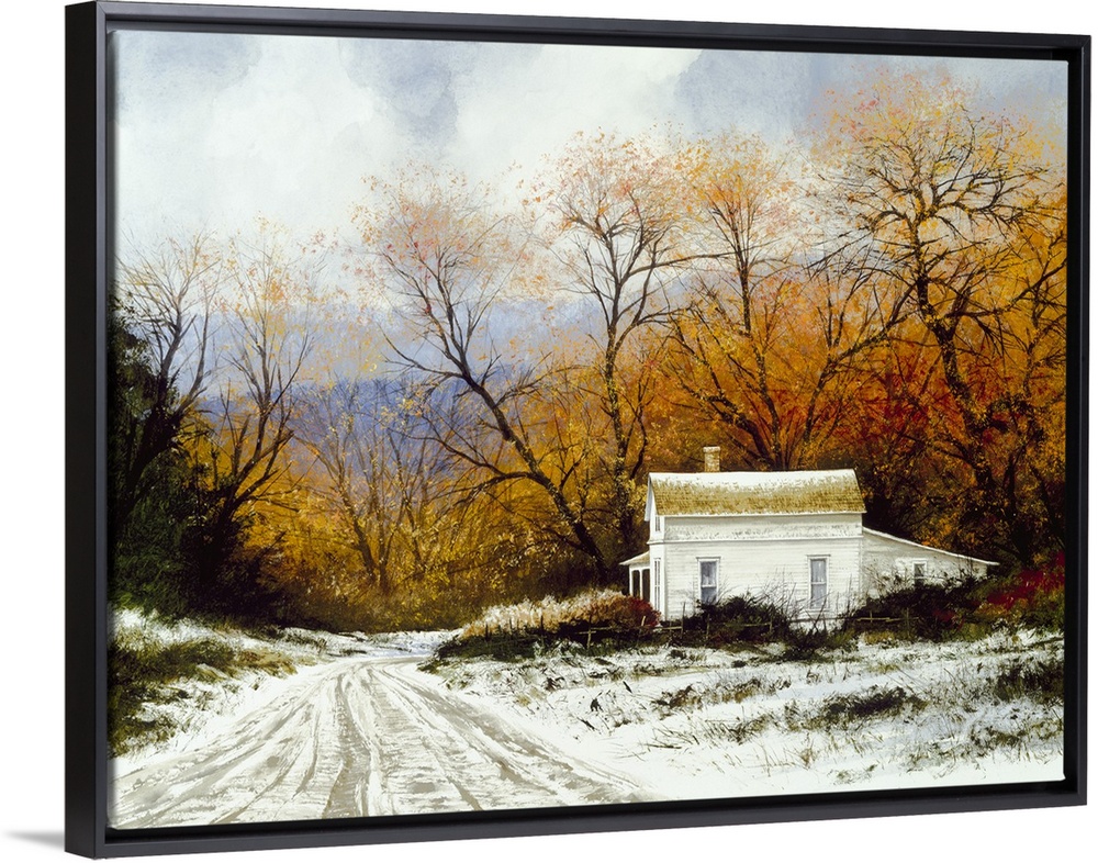 <p>Contemporary painting of a snow covered road leading to a white Victorian house.</p>