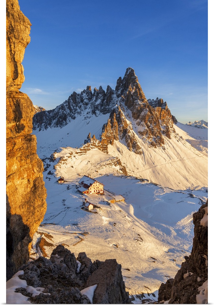 <p>Winter view of mount Paterno and Locatelli hut seen from Sexten rock (Sasso di Sesto), Three peaks of Lavaredo, Dolomites, Trentino Alto Adige (South tyrol), Italy</p>