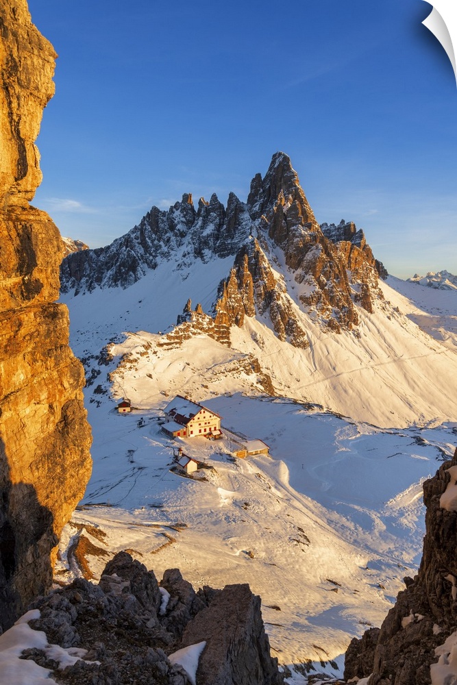 <p>Winter view of mount Paterno and Locatelli hut seen from Sexten rock (Sasso di Sesto), Three peaks of Lavaredo, Dolomites, Trentino Alto Adige (South tyrol), Italy</p>