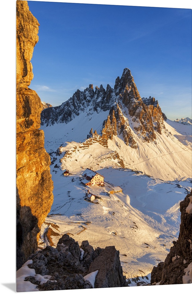 <p>Winter view of mount Paterno and Locatelli hut seen from Sexten rock (Sasso di Sesto), Three peaks of Lavaredo, Dolomites, Trentino Alto Adige (South tyrol), Italy</p>
