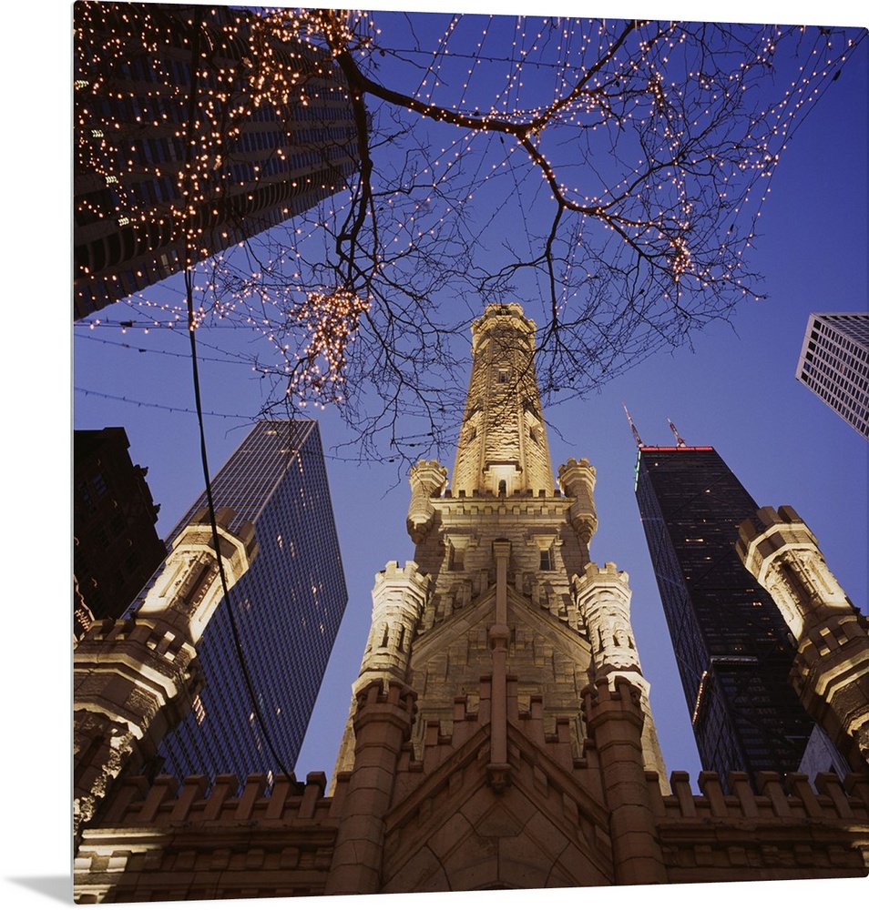 <p>Huge photograph taken from the ground looking up at a tree filled with lights sitting in front of the Chicago Avenue Pumping Station, while the John Hancock Center can be seen in the background extending high into the sky.</p>