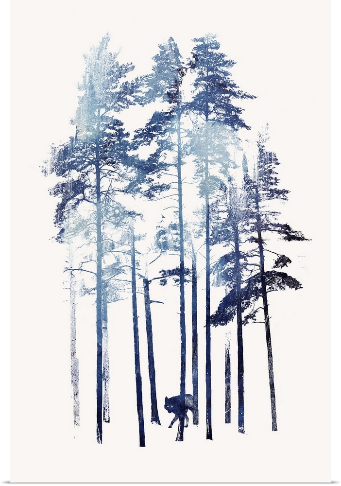 <p>Contemporary artwork of a wolf moving through a grove of tall trees.</p>