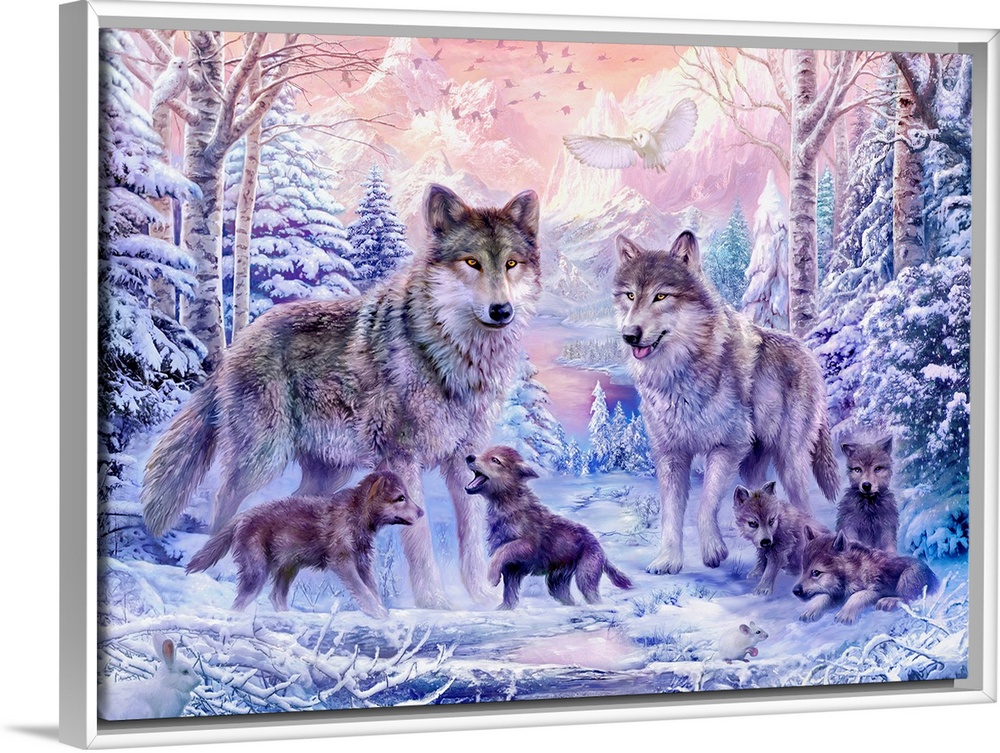 <p>Fantasy painting of two adult wolves with their pups in a snowy landscape with rugged bright mountains in the background.</p>