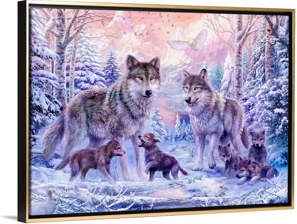 <p>Fantasy painting of two adult wolves with their pups in a snowy landscape with rugged bright mountains in the background.</p>