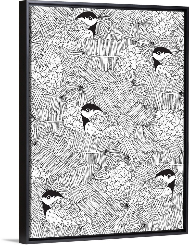 <p>Contemporary lined art with designed birds, leaves, and pine cones.</p>
