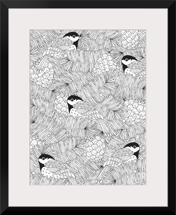 <p>Contemporary lined art with designed birds, leaves, and pine cones.</p>