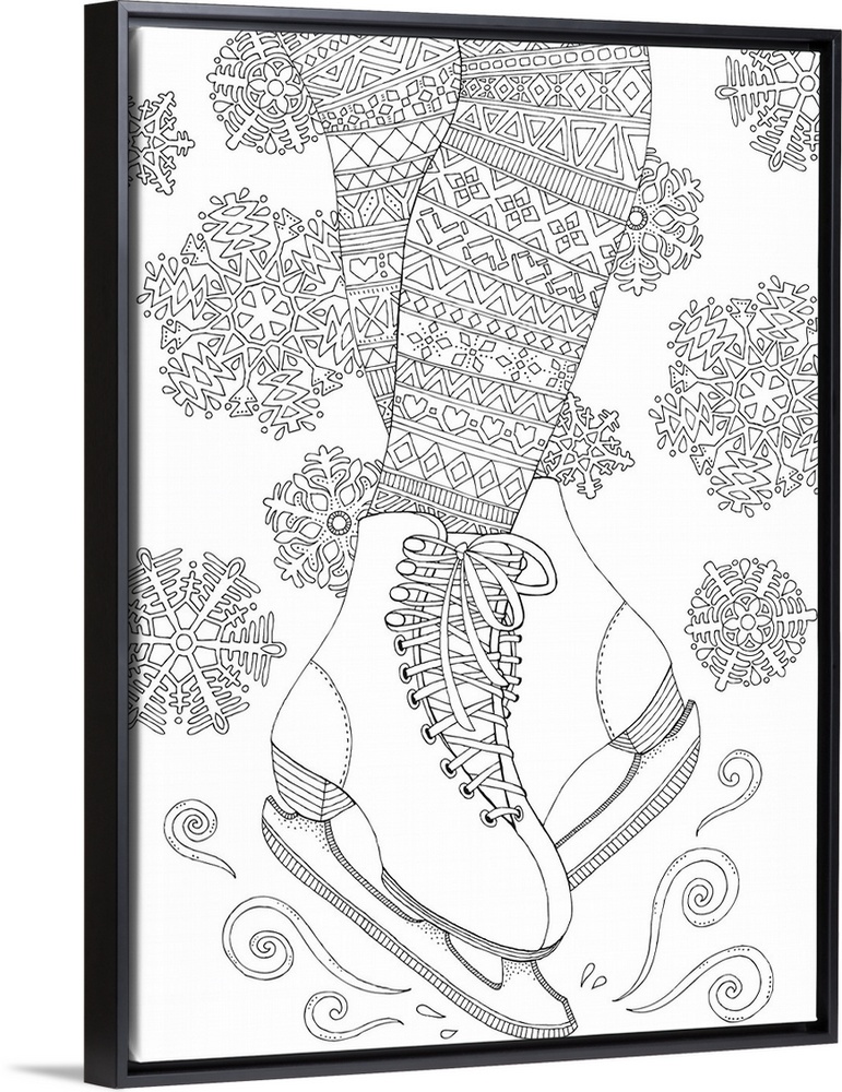 <p>Winter themed black and white lined art of a pair of ice skates and snowflakes.</p>