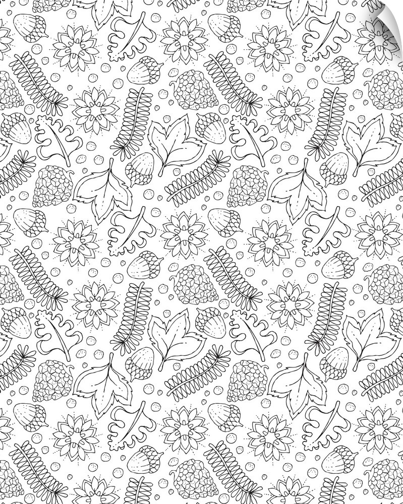 <p>Black and white Winter themed pattern of winter vegetation such as pine cones, acorns, leaves, and ferns.</p>