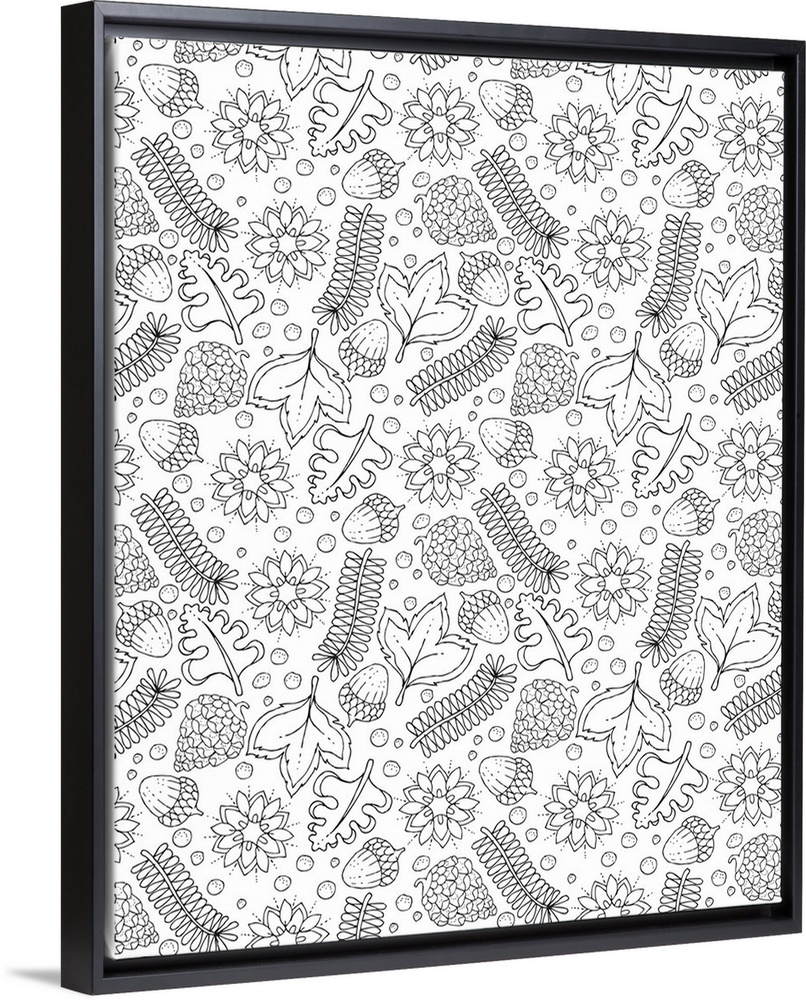 <p>Black and white Winter themed pattern of winter vegetation such as pine cones, acorns, leaves, and ferns.</p>