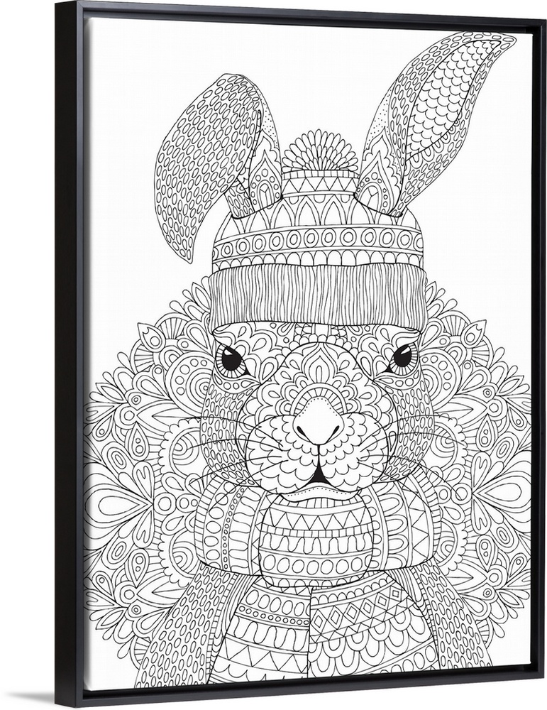<p>Black and white lined design of a rabbit wearing a winter hat and scarf.</p>