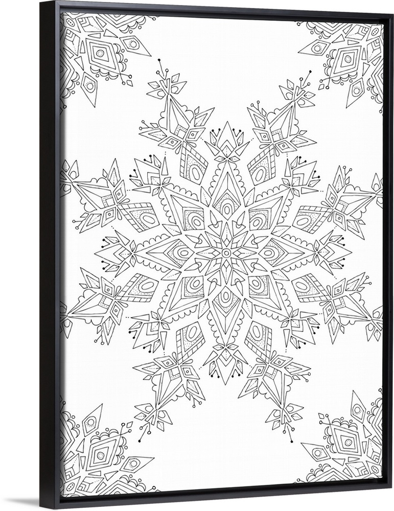 <p>Black and white line art of intricately designed snowflakes.</p>
