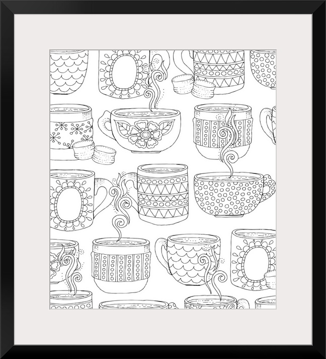 <p>Black and white line art pattern of coffee mugs with steaming hot chocolate inside.</p>