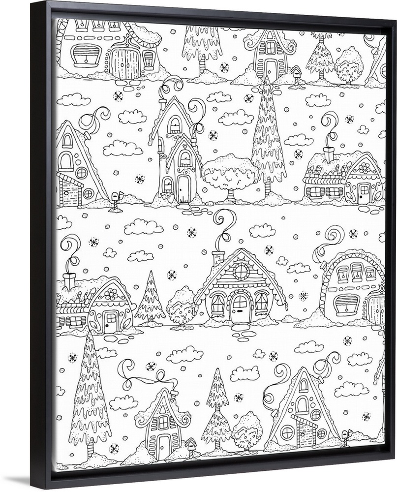 <p>Black and white lined design of a winter wonderland scene with different styled houses and snow.</p>