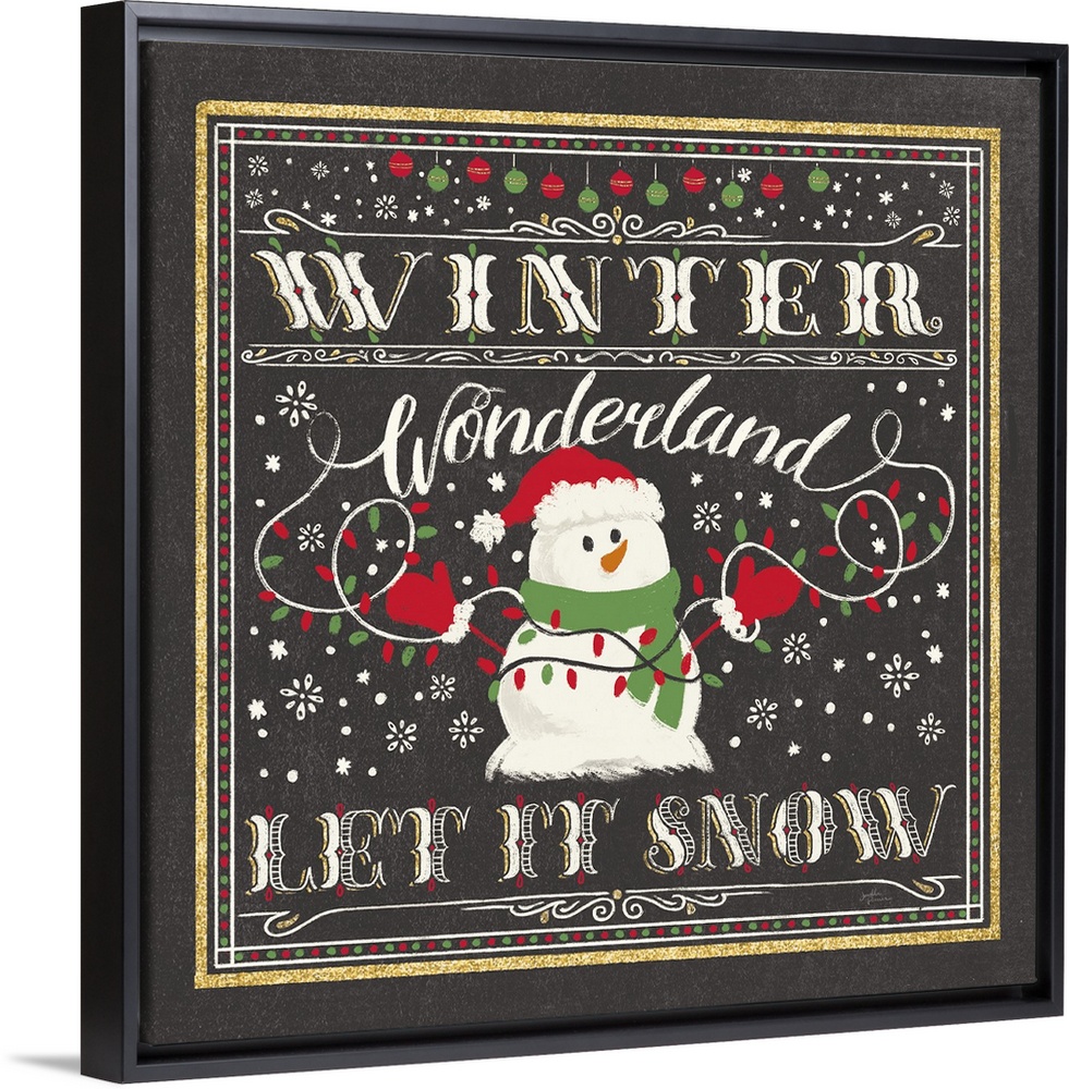 <p>"Winder Wonderland, Let It Snow" with a snowman holding lights on a black backdrop and gold accents throughout.</p>