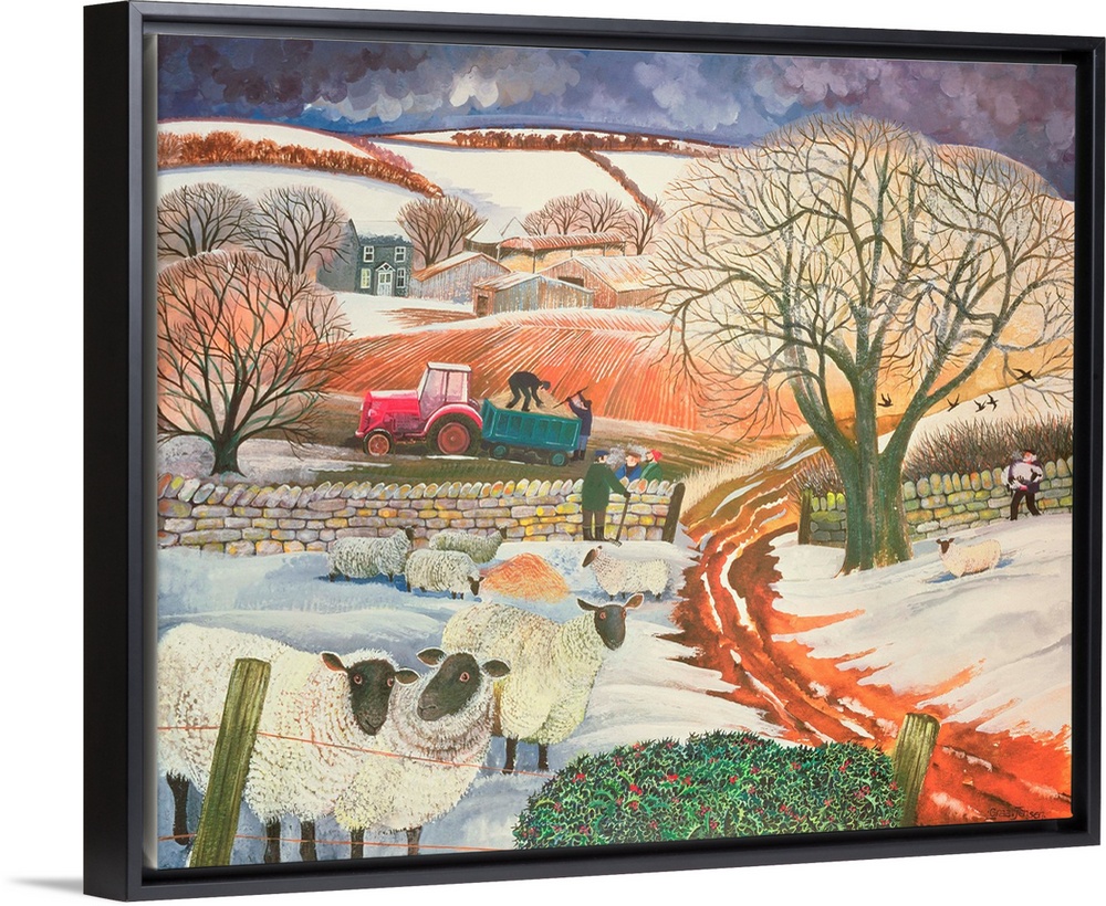 <p>Contemporary painting of a flock of sheep in the countryside in the winter.</p>