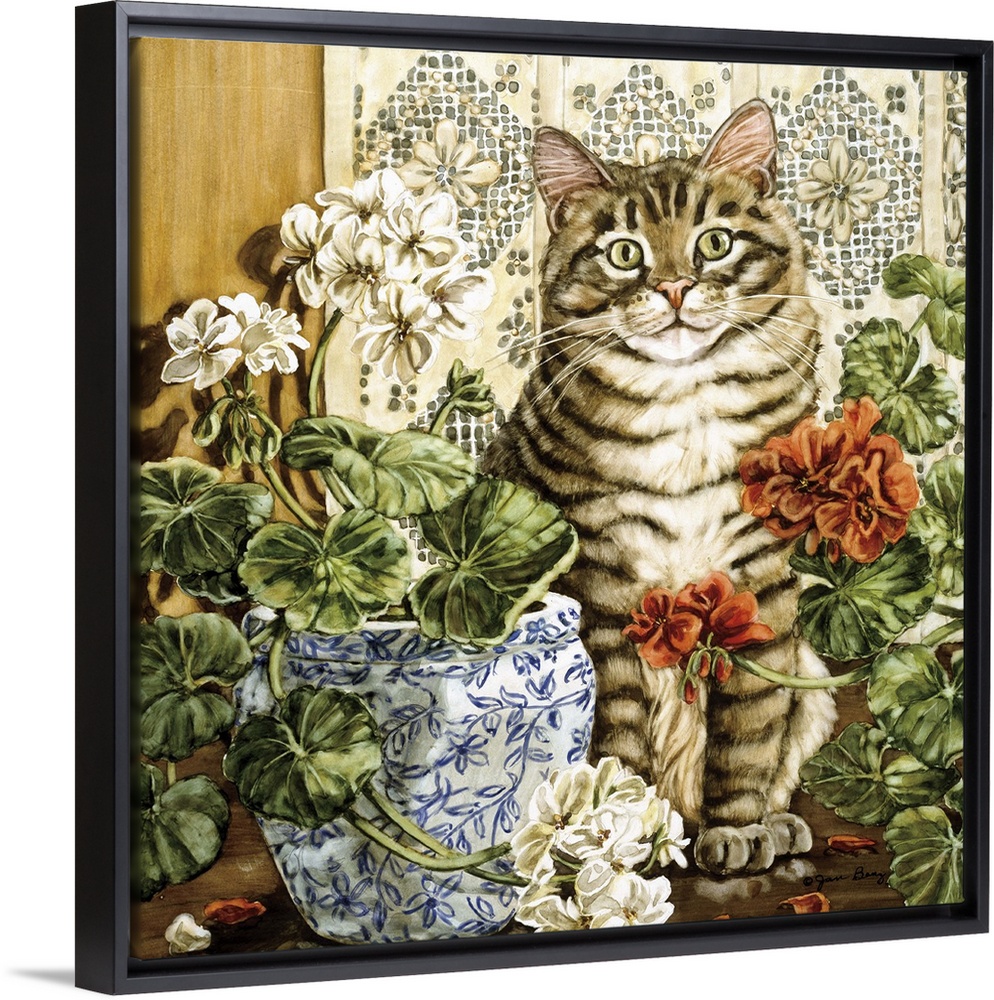 <p>Contemporary painting of a cat sitting, on a table with flowers in vases.</p>