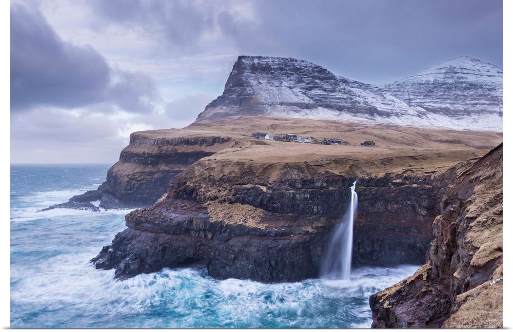 <p>Wintry conditions at Gasadalur on the island of Vagar, Faroe Islands, Denmark, Europe. Winter (March) 2015.</p>