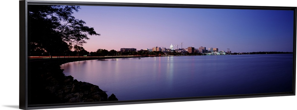<p>Panoramic photo print of buildings in Madison on the waterfront lit up at dusk.</p>