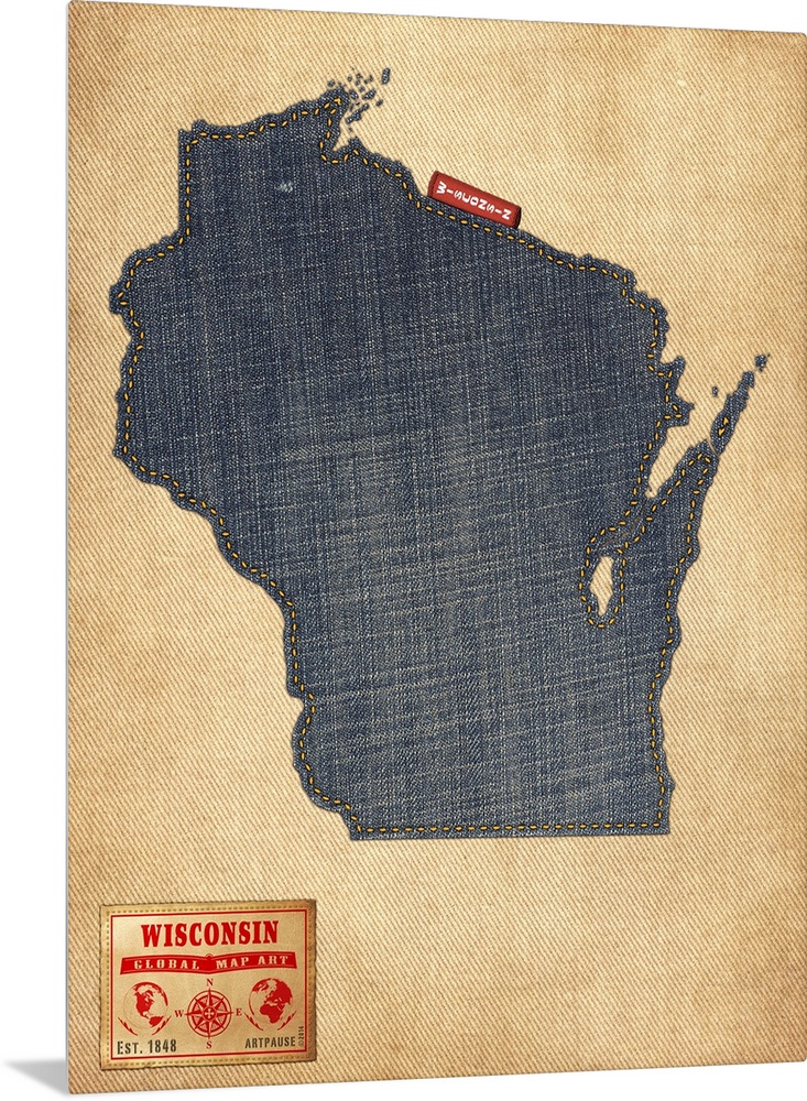 <p>Contemporary artwork of the state of Wisconsin made of denim, against a rustic background.</p>