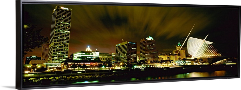 <p>Wide angle photograph from water level of skyline lit up on panoramic wall art.</p>