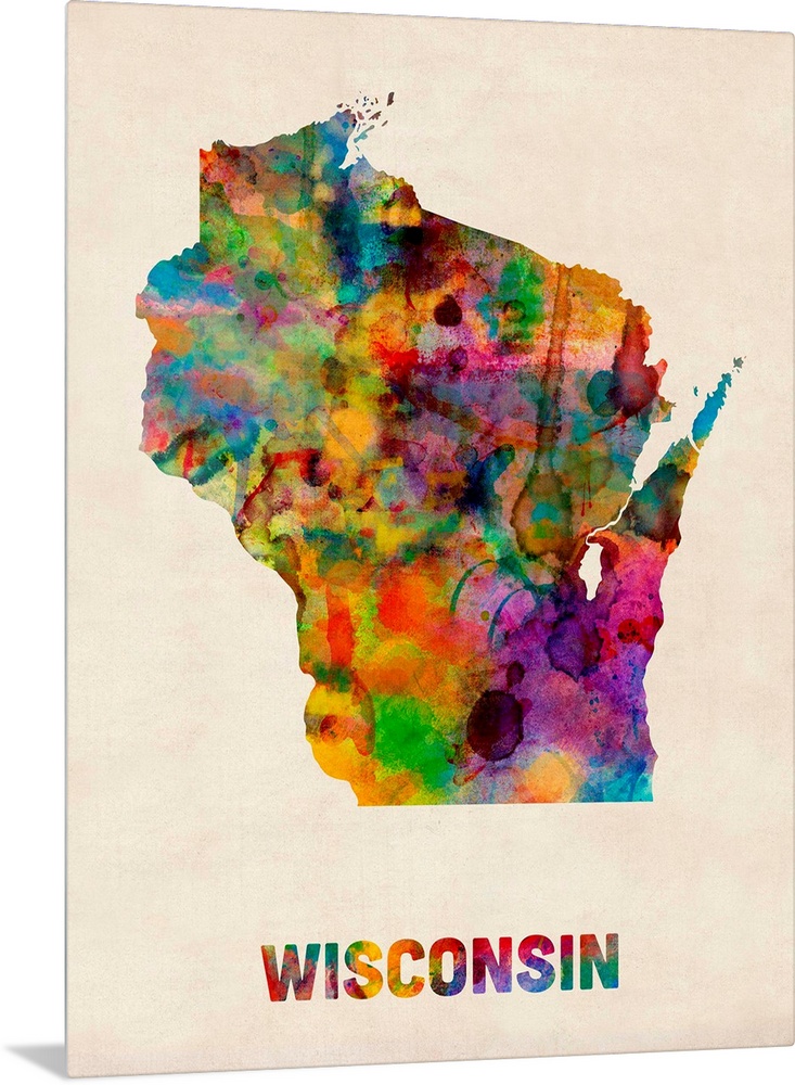<p>Contemporary piece of artwork of a map of Wisconsin made up of watercolor splashes.</p>