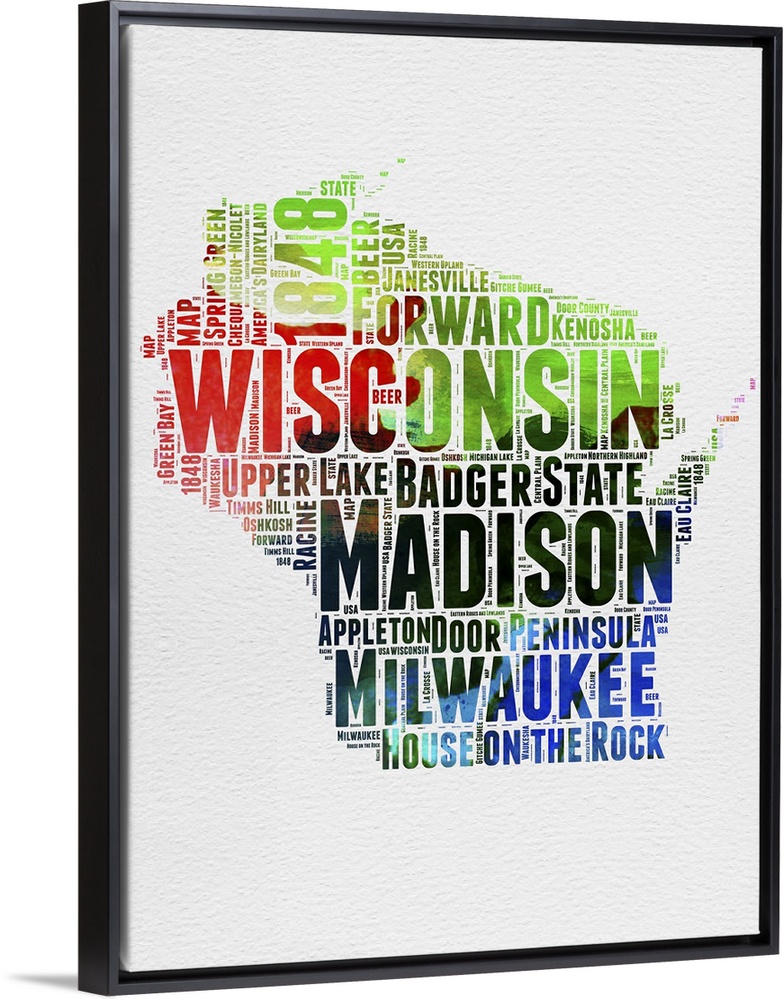 <p>Watercolor typography art map of the US state Wisconsin.</p>