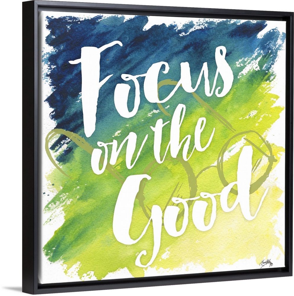 <p>"Focus on the Good" on a blue to yello gradient watercolor background with circular framed eyeglasses behind the words.</p>