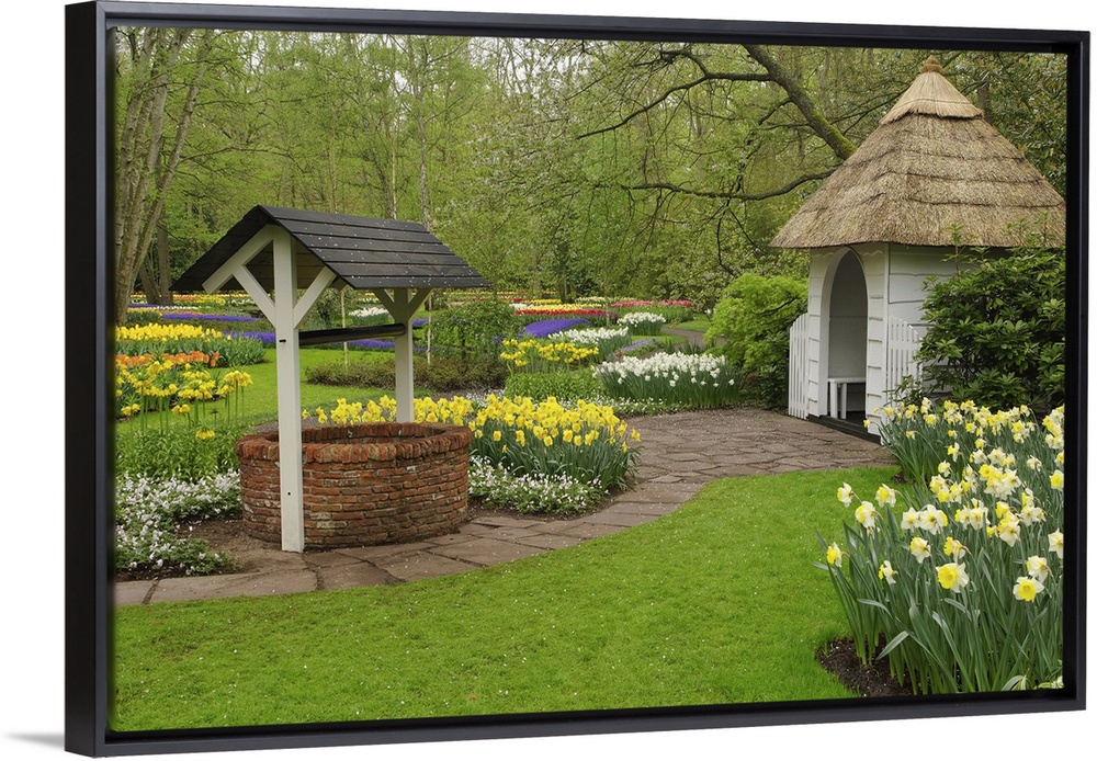 <p>Wishing well in garden, Keukenhof Gardens, Lisse, Netherlands, Holland</p>