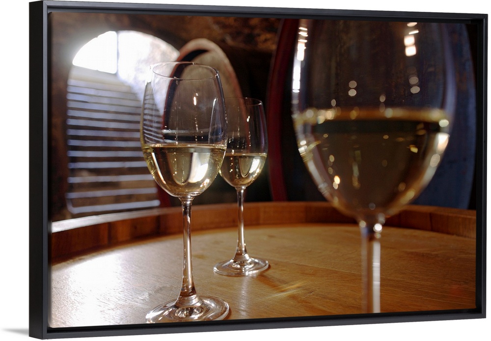 <p>Landscape, close up, large photograph of three glasses of white wine sitting on a wooden surface, the background is a wine cellar with barrels, stone walls and a staircase leading up toward the daylight.</p>