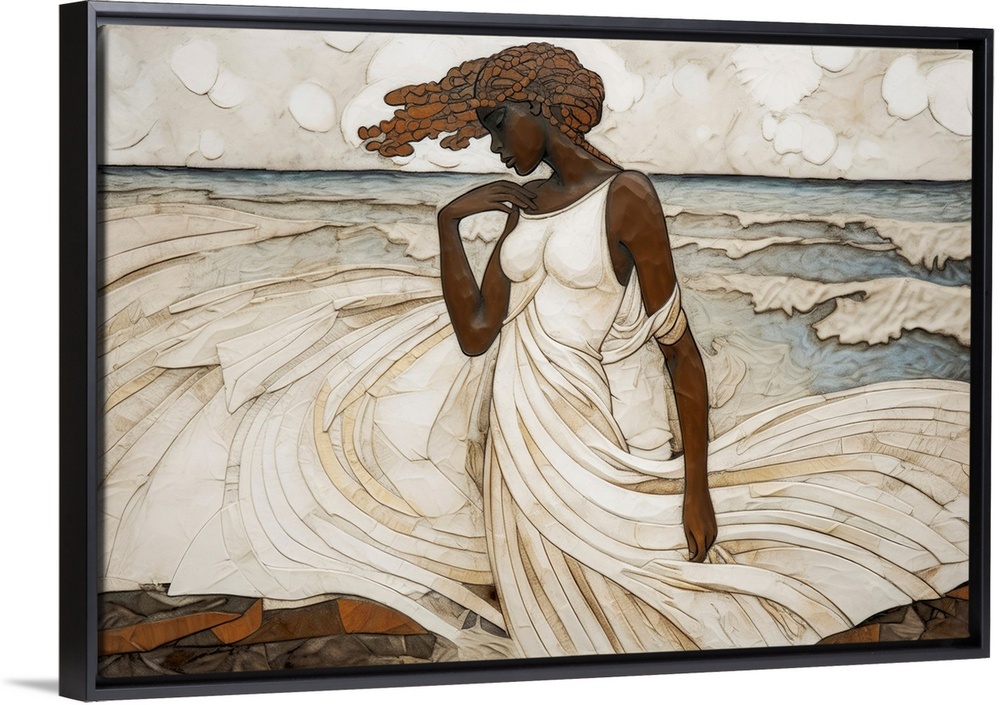 <p>A contemporary yet classic collage of a black woman in a large flowing white dress in front of the ocean.</p>