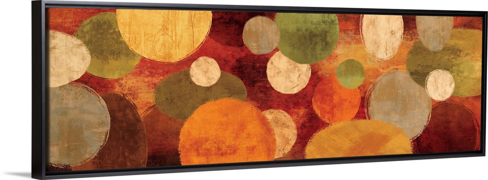 <p>Panoramic abstract art with colorful circular shapes in hues of green, cream, yellow, gray, and orange on a red and yellow background.</p>