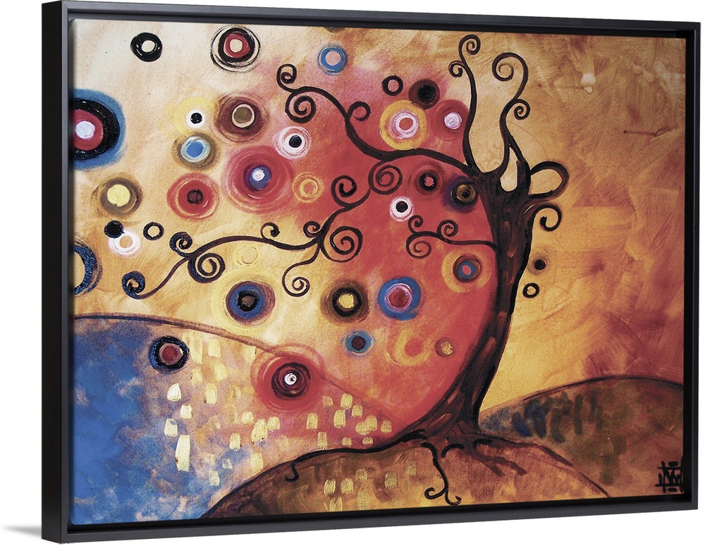 <p>Contemporary painting of a tree with thin, spiraling branches and round spheres of color with a vivid sky.</p>