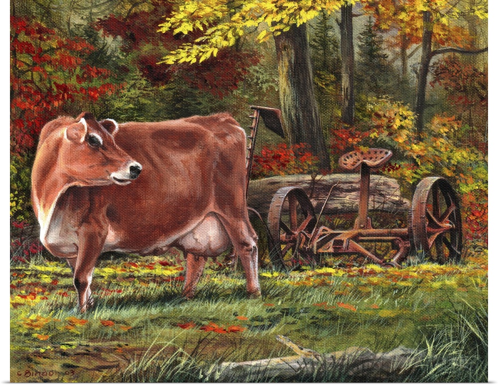 <p>Contemporary painting of a cow in a forest clearing next to an old piece of farm equipment.</p>